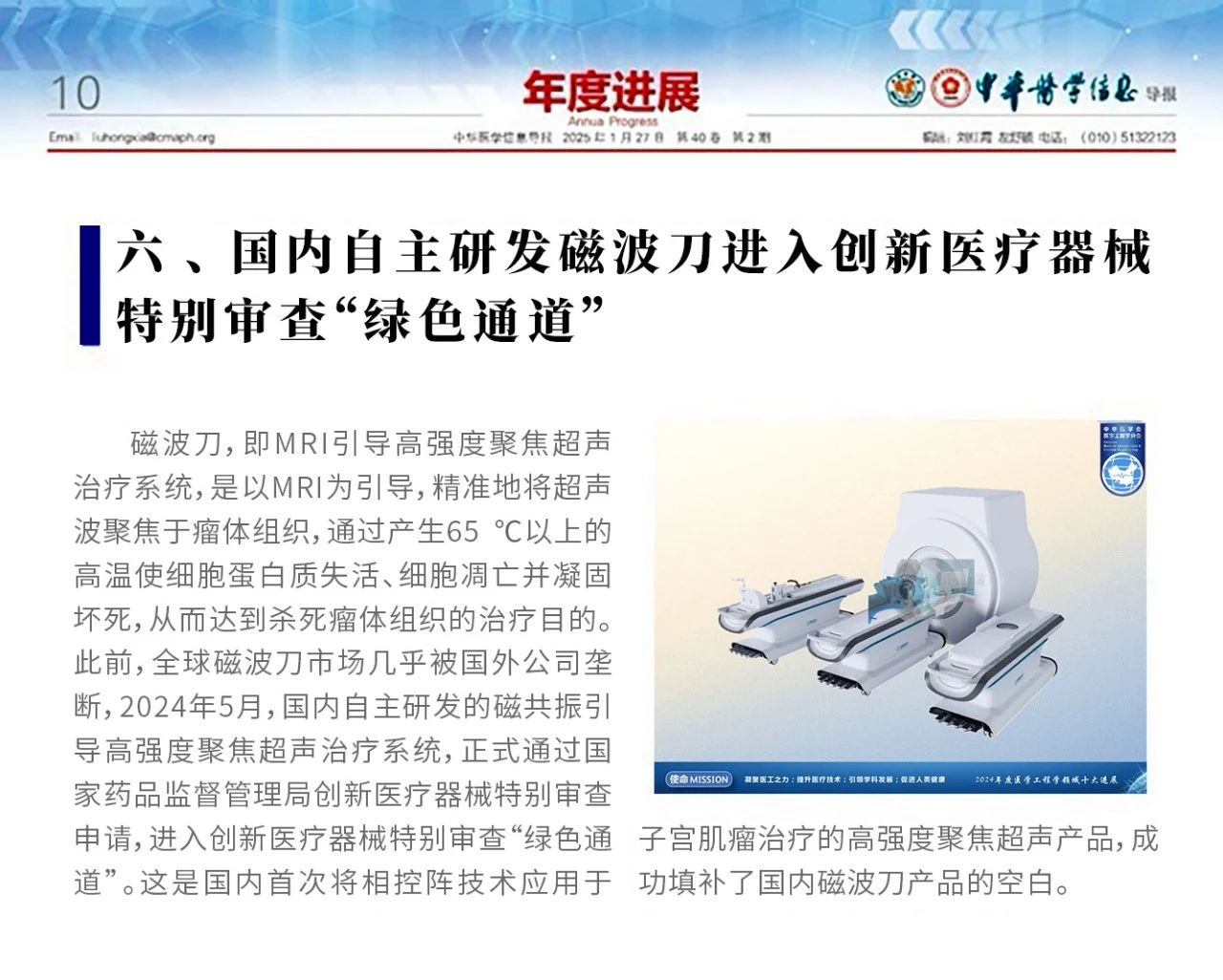 1月22日,中華醫(yī)學會醫(yī)學工程學分會正式發(fā)布2024年度醫(yī)學工程學領域十大進展,上海沈德無創(chuàng)時代醫(yī)療科技有限公司(以下簡稱"沈德無創(chuàng)時代")自主研發(fā)的磁共振引導高強度聚焦超聲治療系統(tǒng)(磁波刀)憑借重大技術突破成功入選。